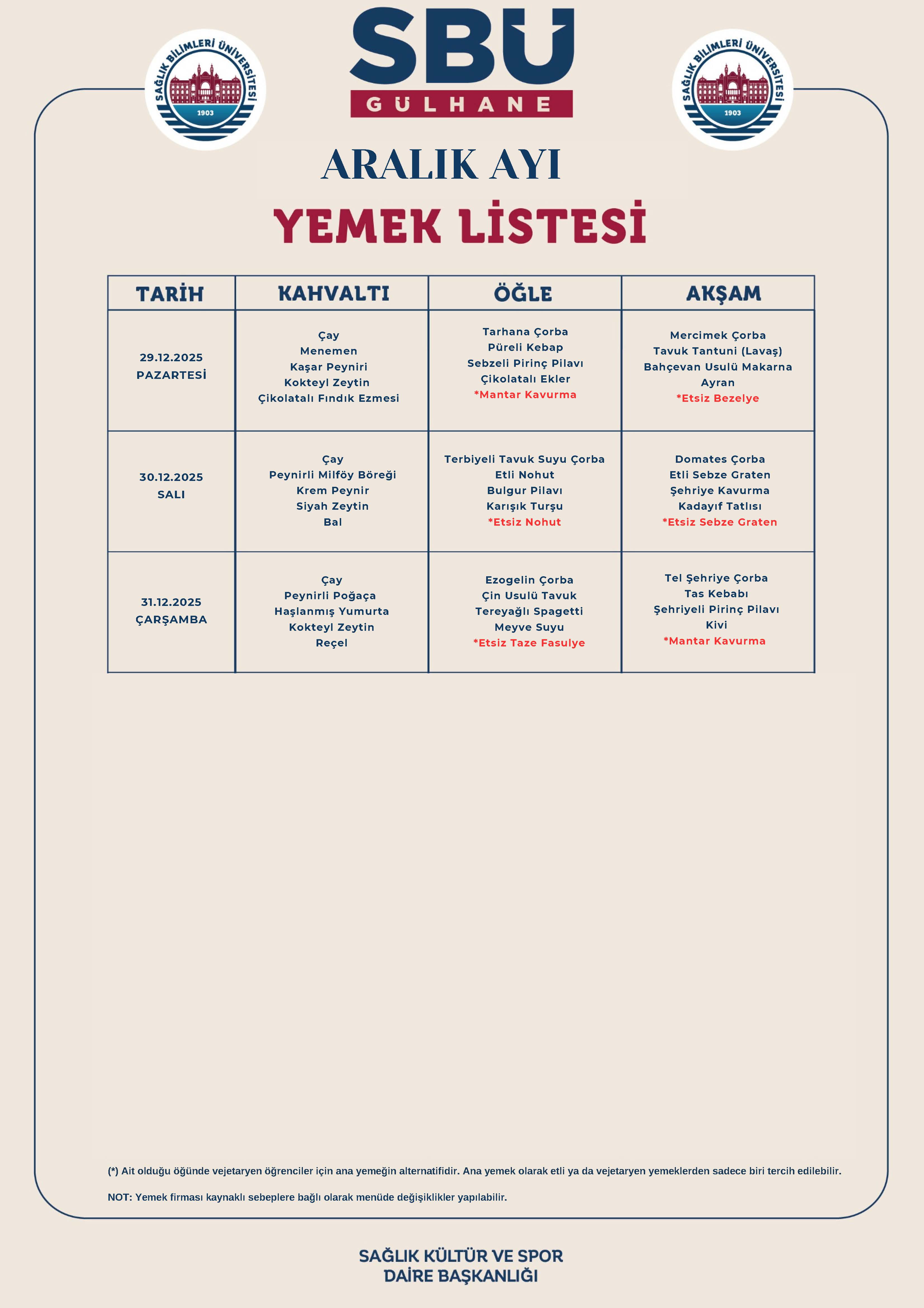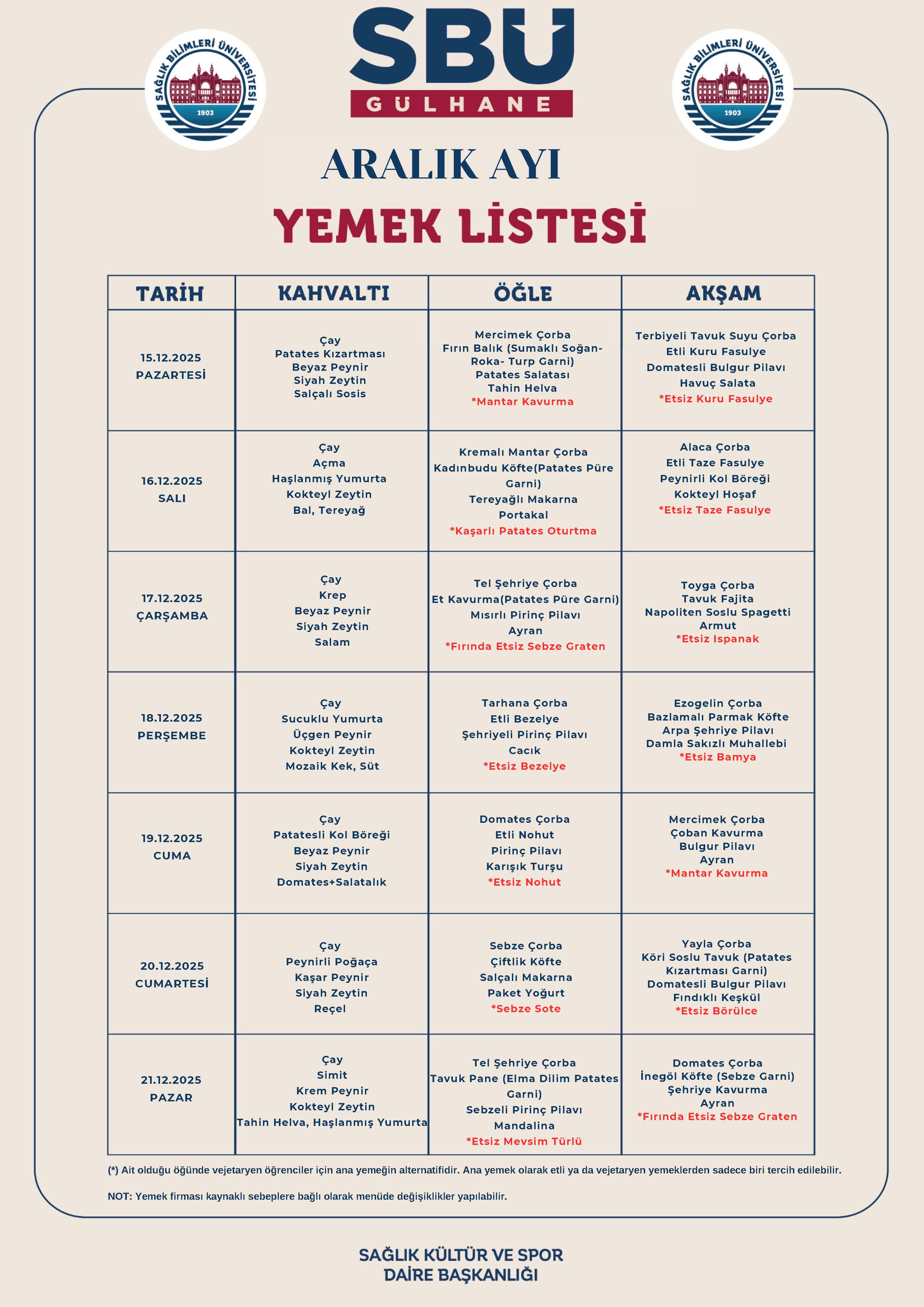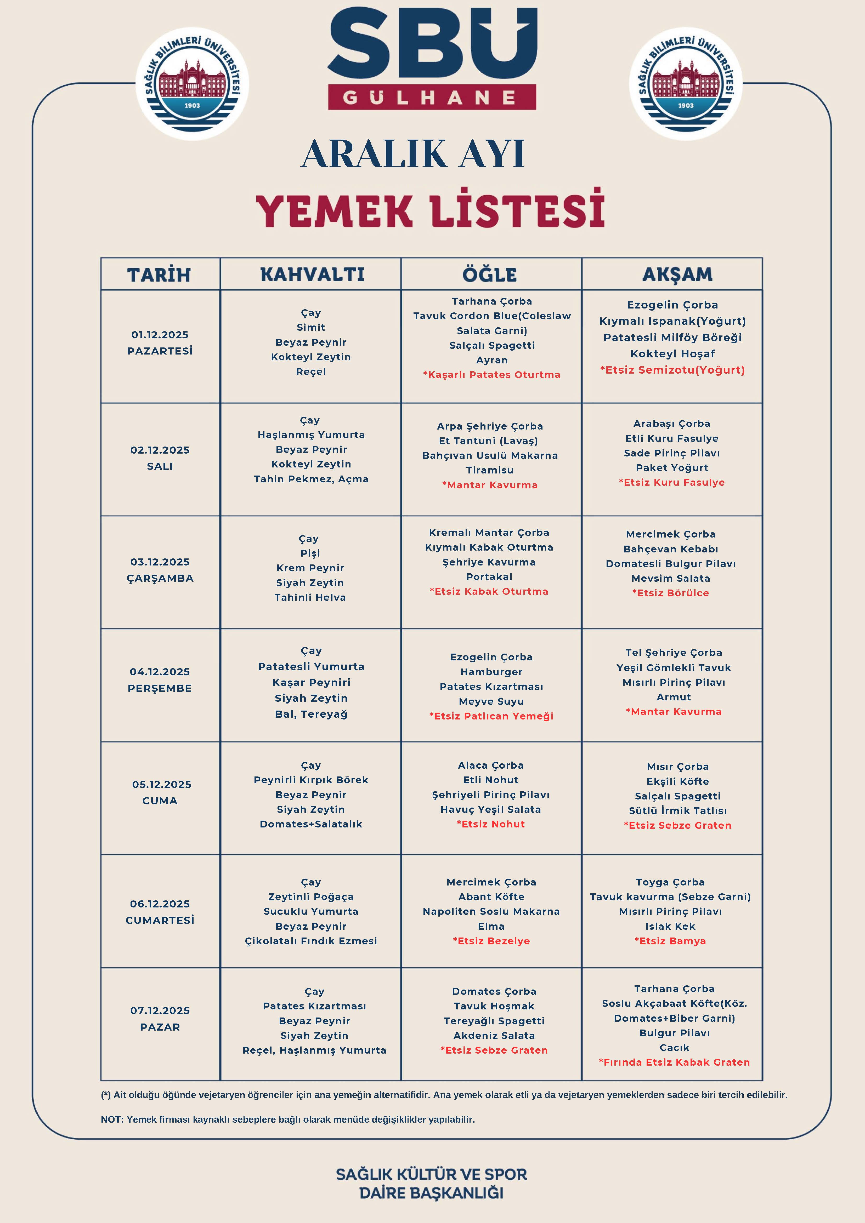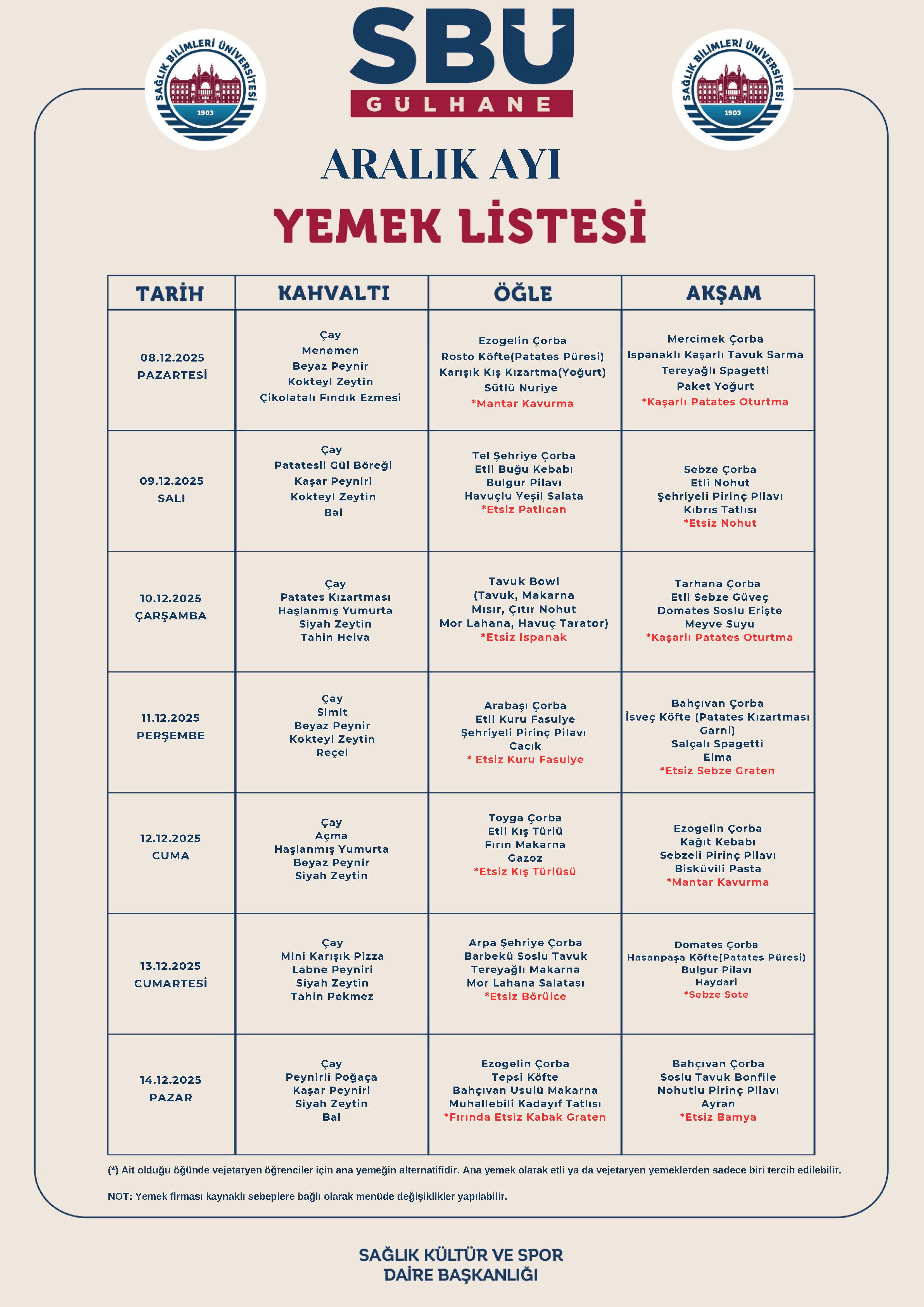 • Gülhane Külliyesi Aralık Ayı Yemek Listesi