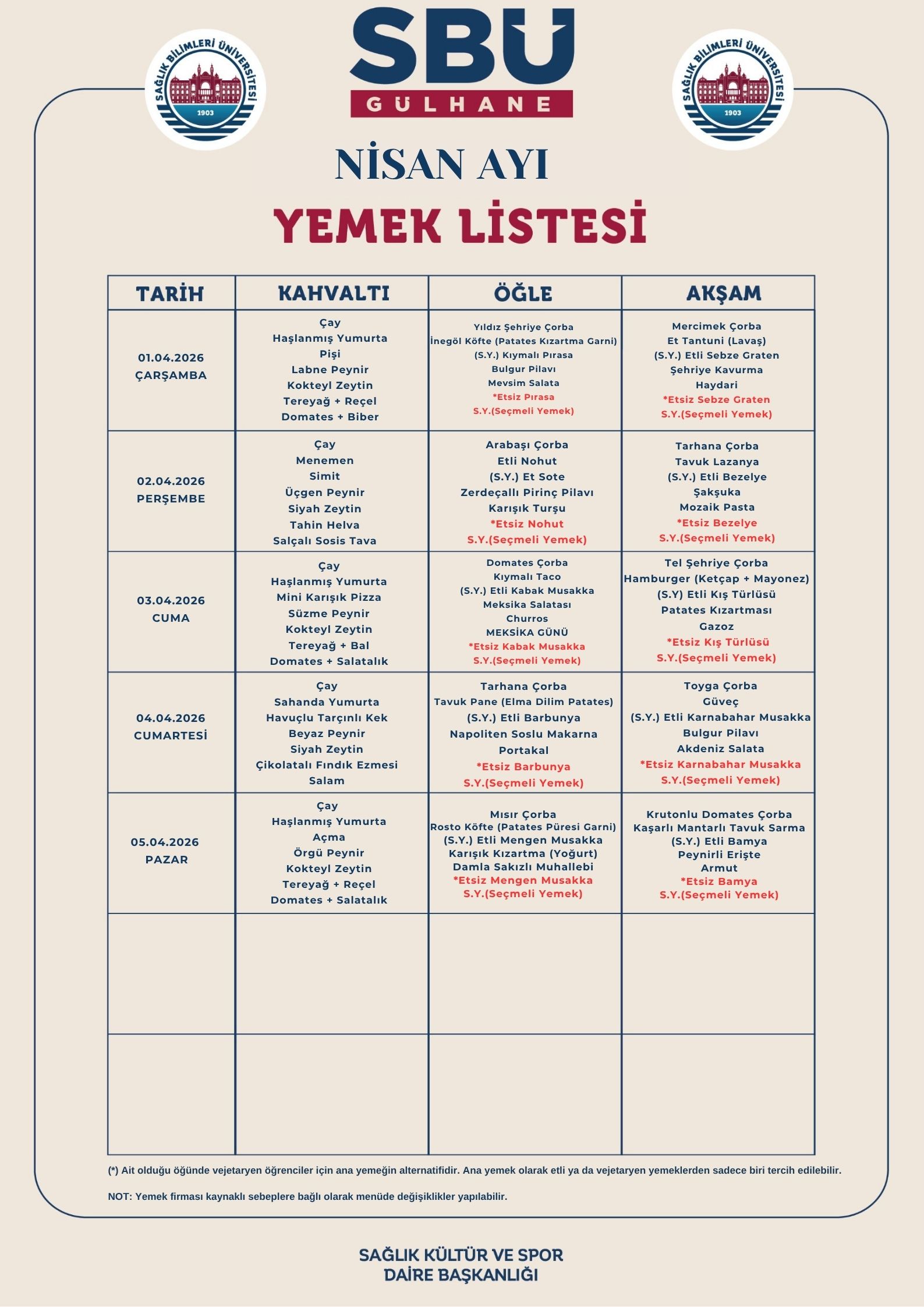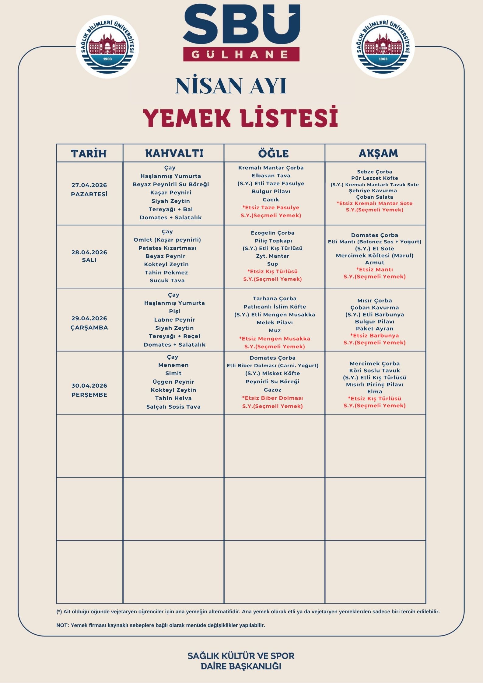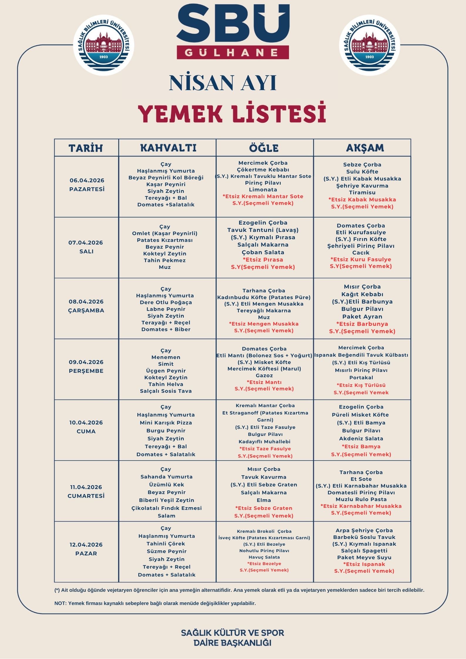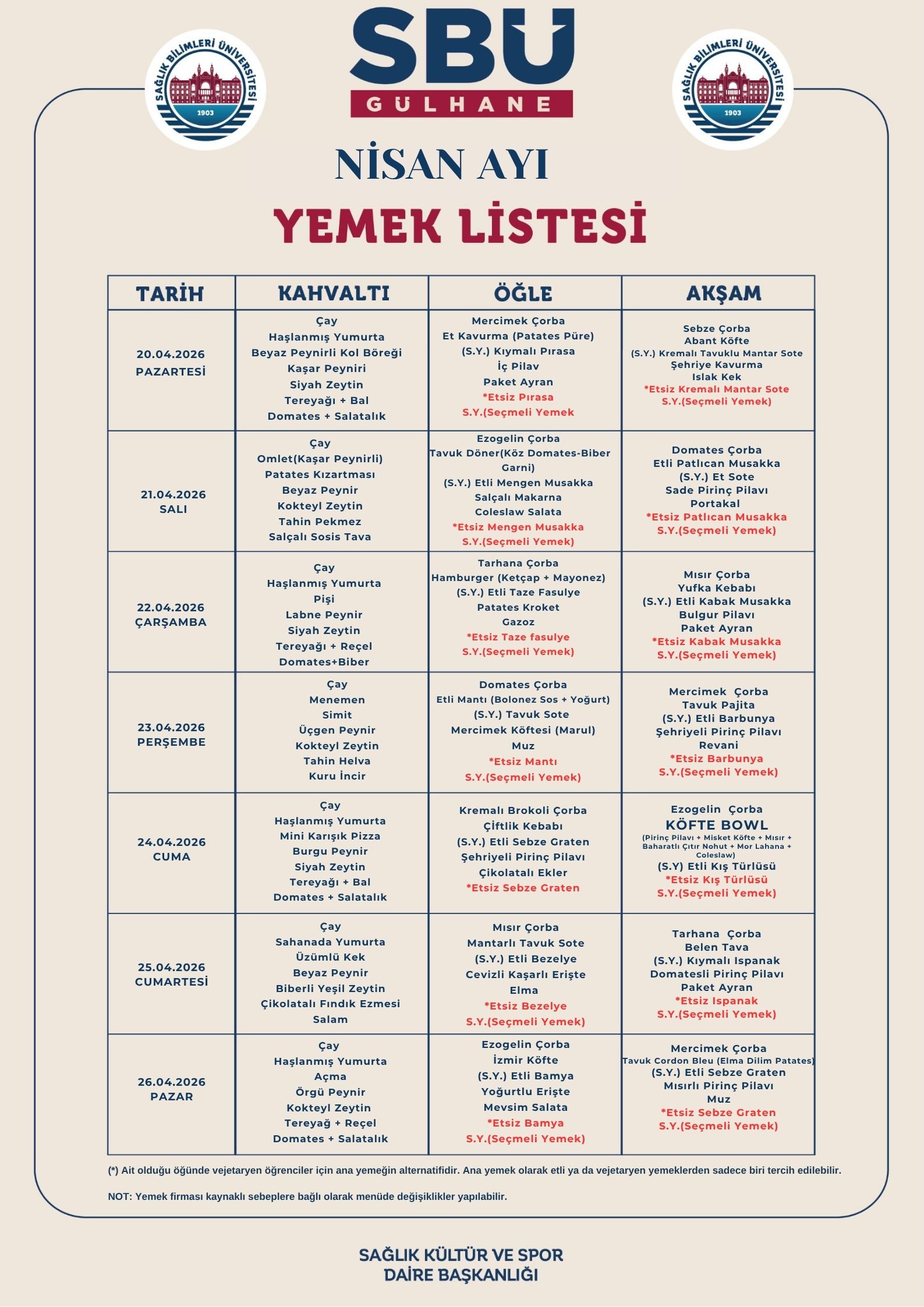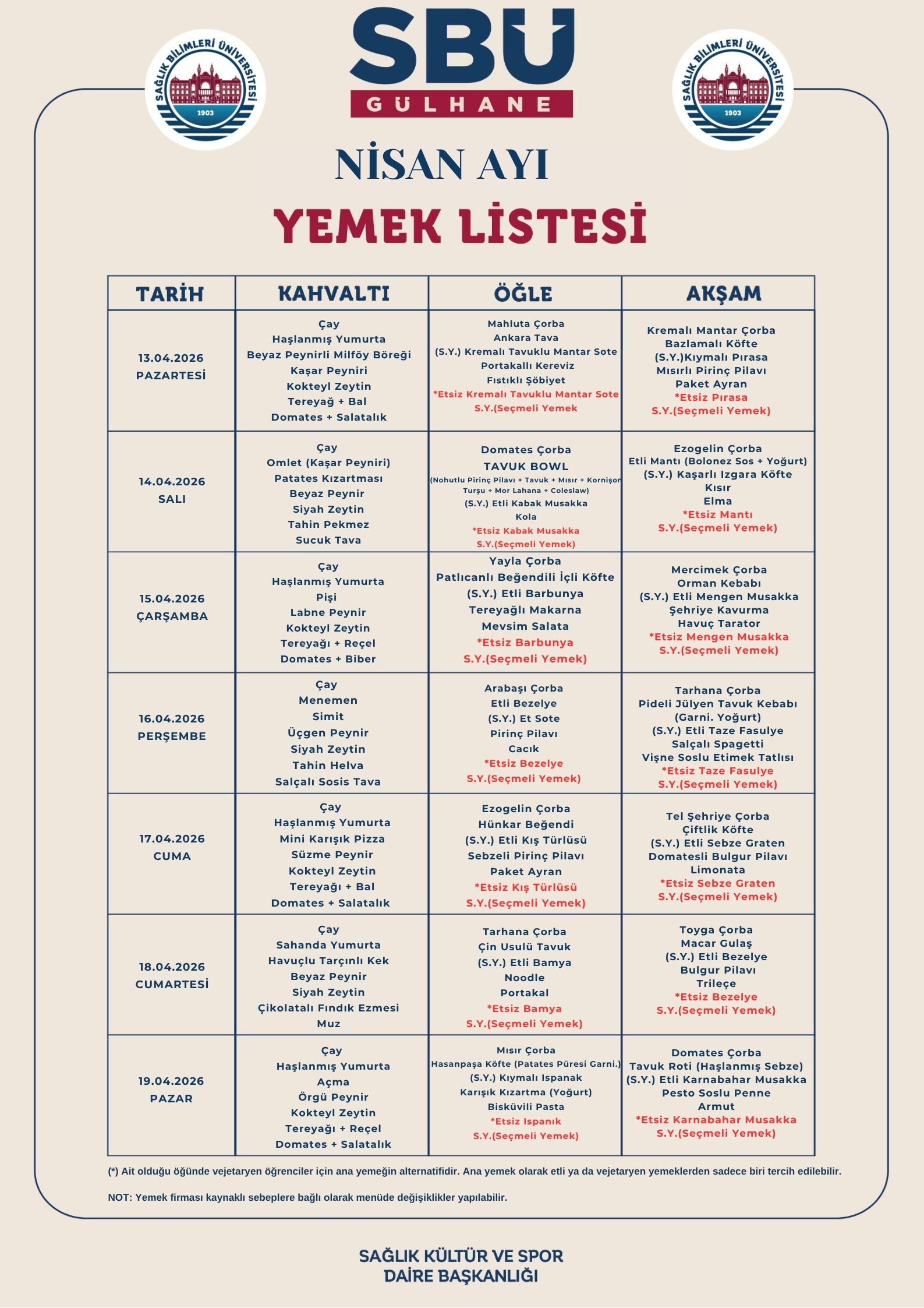 Gülhane Külliyesi Nisan Ayı Yemek Listesi