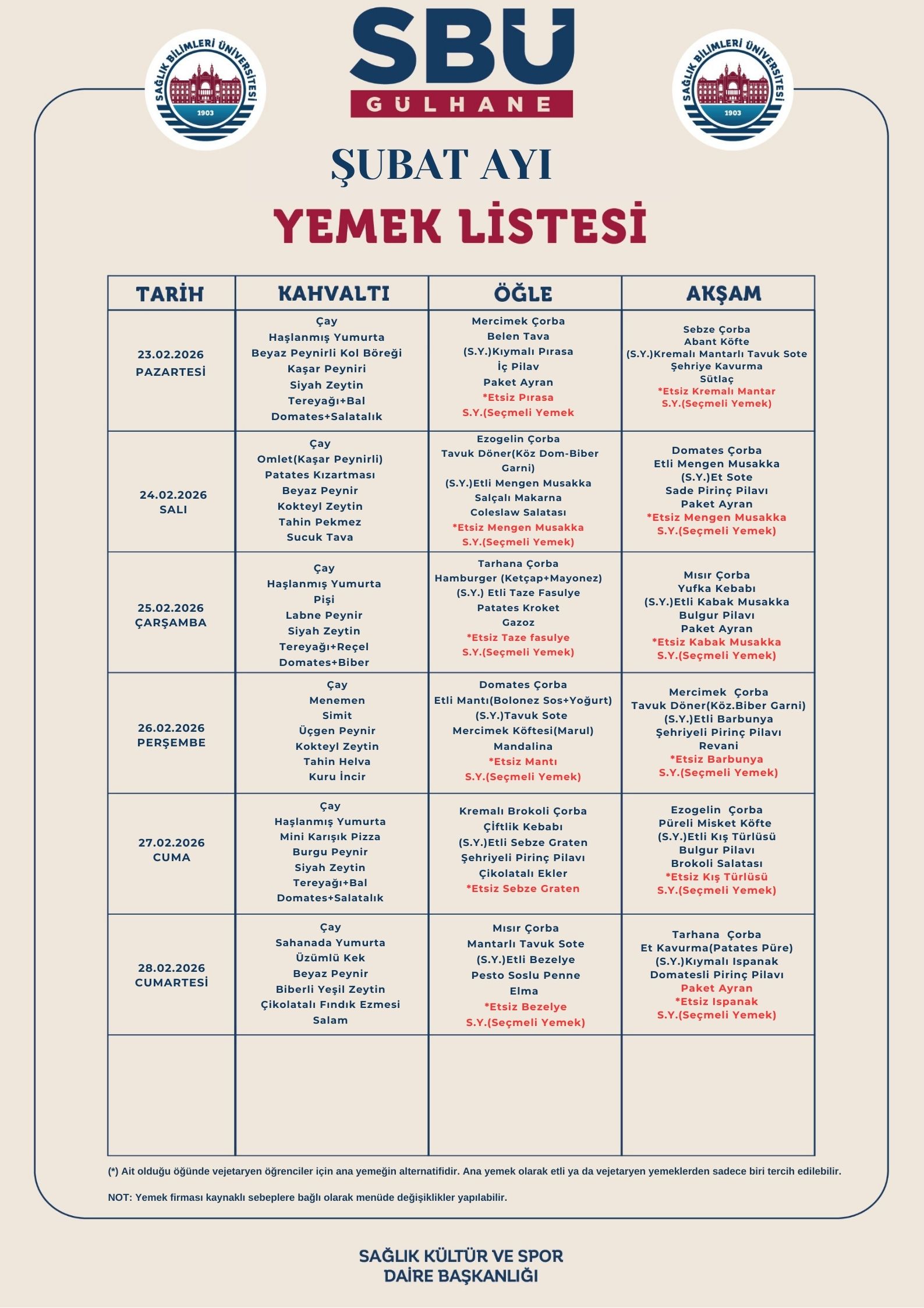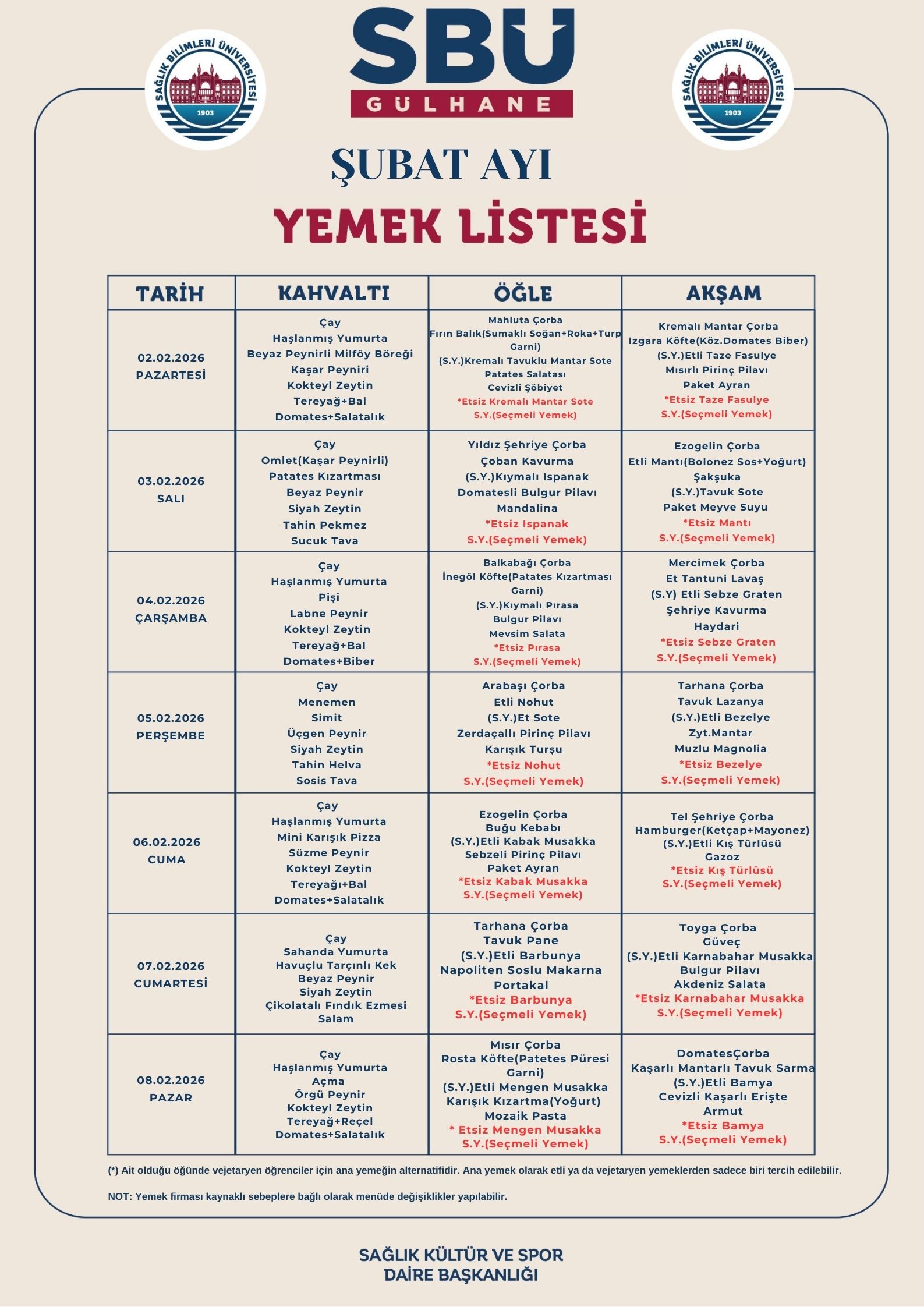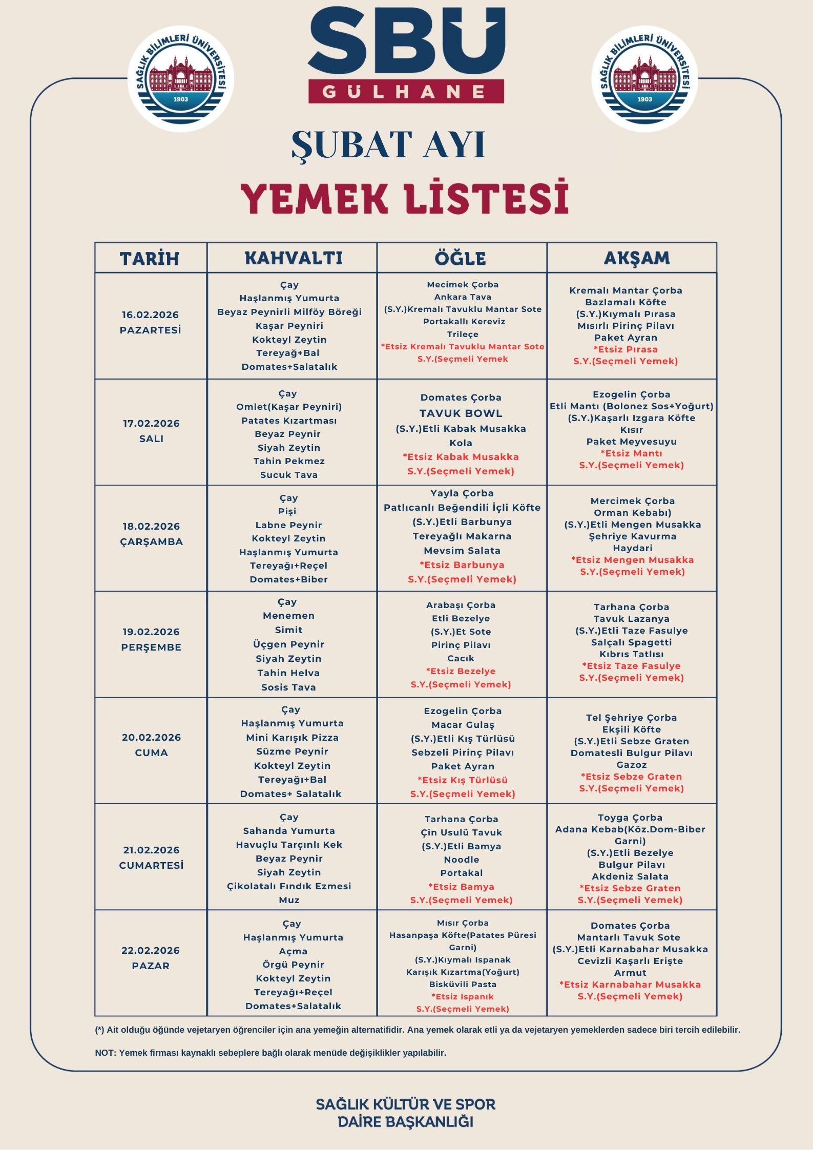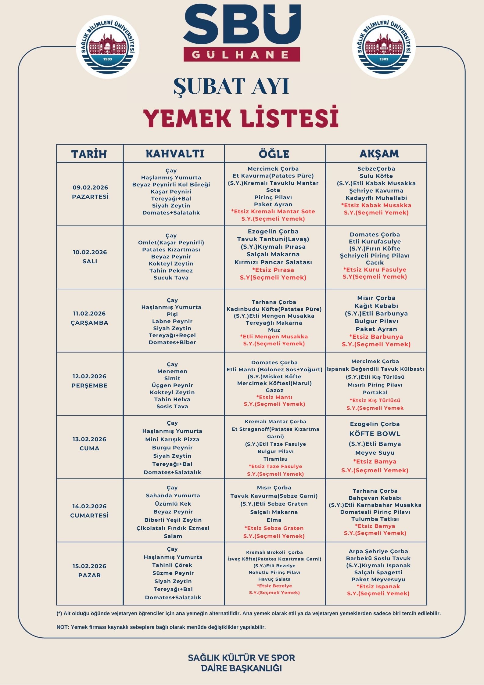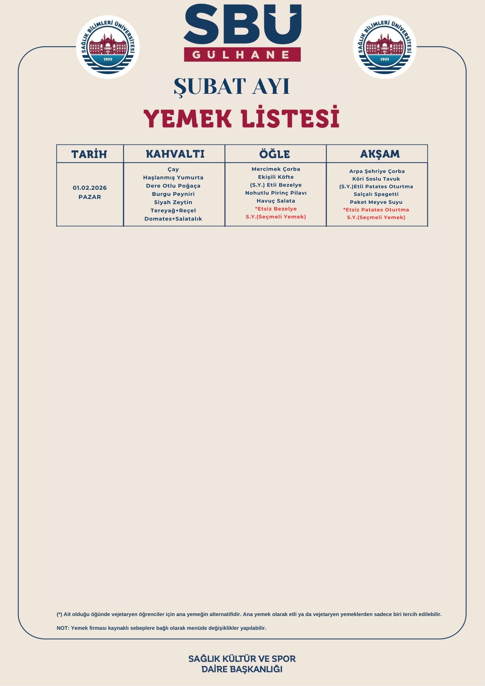 Gülhane Külliyesi Şubat Ayı Yemek Listesi
